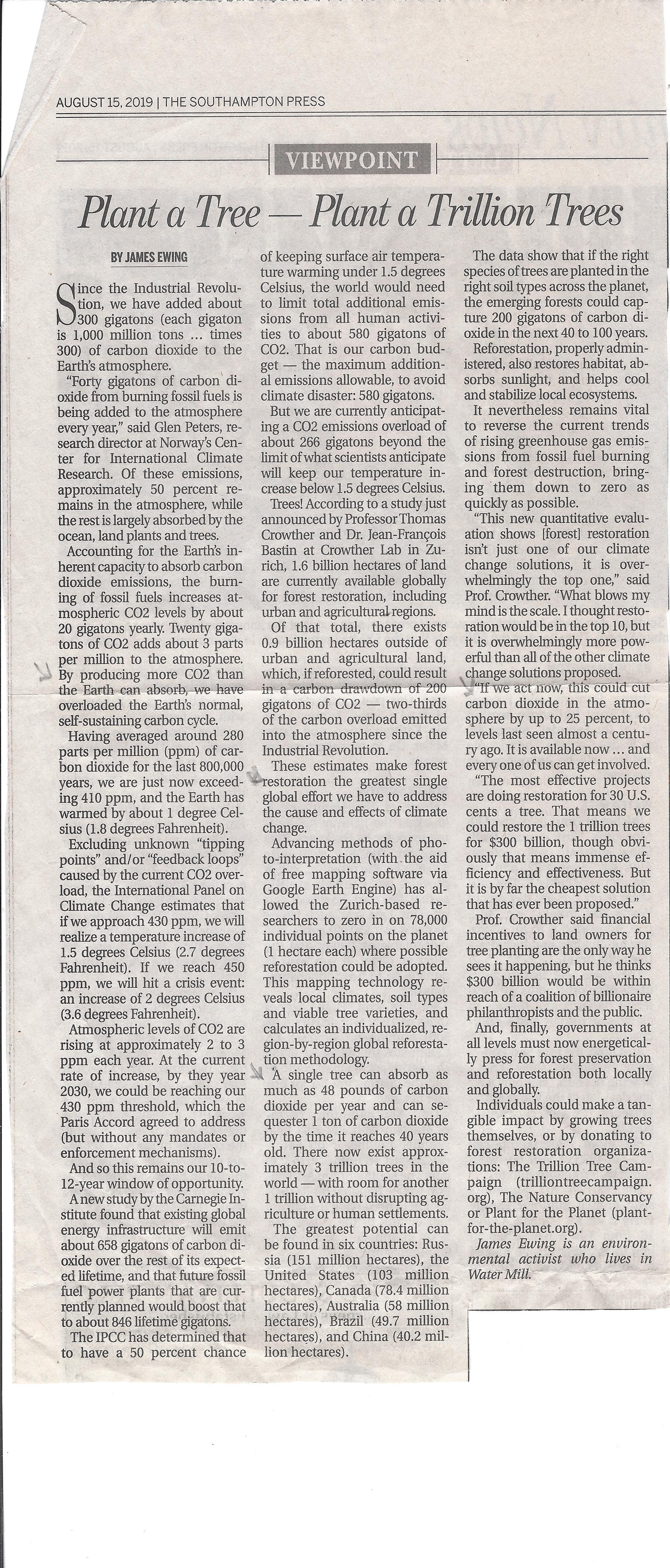 Trees supply us with oxygen, food, shelter, fuel, beauty and shade. They provide exercise when the fallen leaves have to be raked in the fall. And fun for kids who get to jump into the piles. According to James Ewing (Viewpoint, Plant a Tree – Plant a Trillion Trees) in the Southampton Press, 8/15/2019, we are producing more CO2 than the Earth can absorb and we have overloaded the Earth’s normal, self-sustaining carbon cycle. Forest restoration is the greatest single global effort we have to address the cause and effects of climate change. If we act now, this could cut carbon dioxide by up to 25%. A single tree can absorb as much as 48 pounds of carbon dioxide per year.
